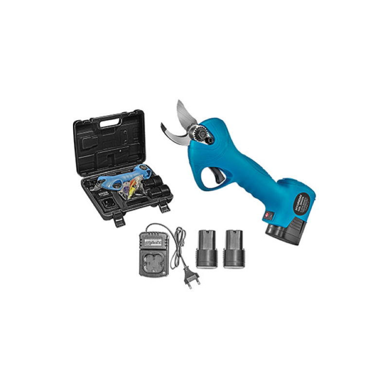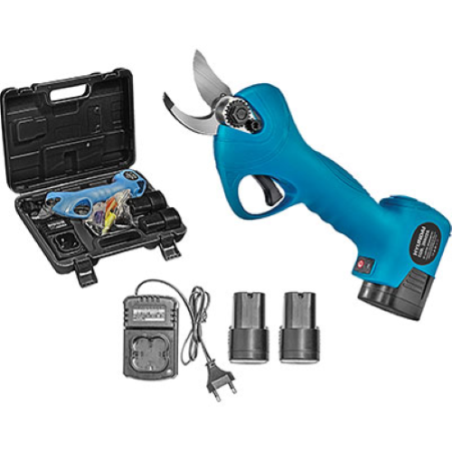 A batteria al Litio da 18V. Con lame in acciaio, per rami di diametro fino a Mm. 25. Peso Kg. 1,2. Tempo di lavoro: da 3 a 4 ore con carica al 100%. In dotazione: 2 batterie da 2 Ah, carica batterie, lubrificante, kit di manutenzione, valigetta.