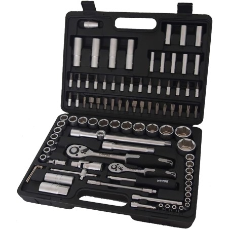 1/2”: 24 bussole - 2 prolunghe - 1 snodo cardanico - 2 adattatori - 1 cricchetto reversibile - 3 chiavi maschio esagonale - 15 inserti misti -17 inserti a bussola misti